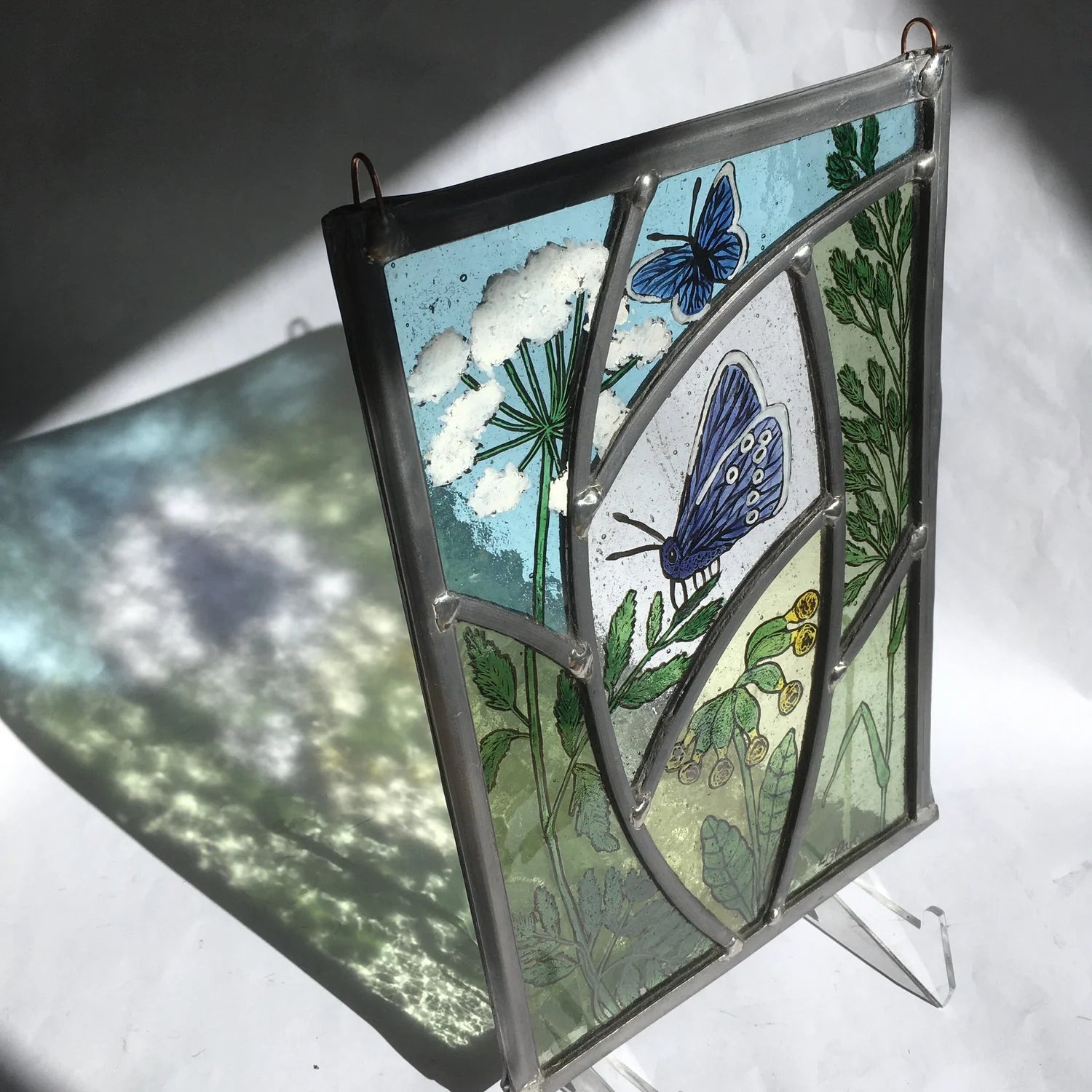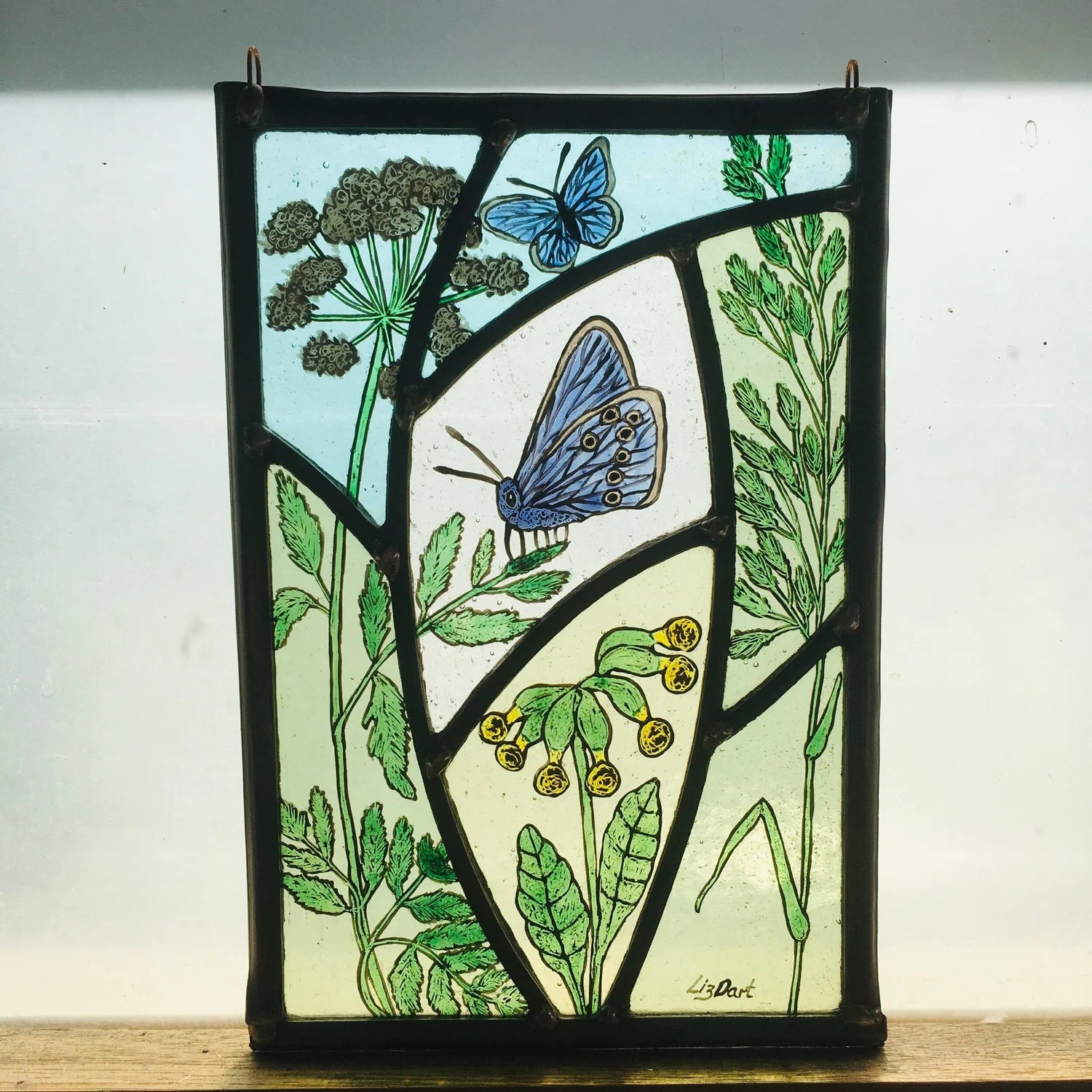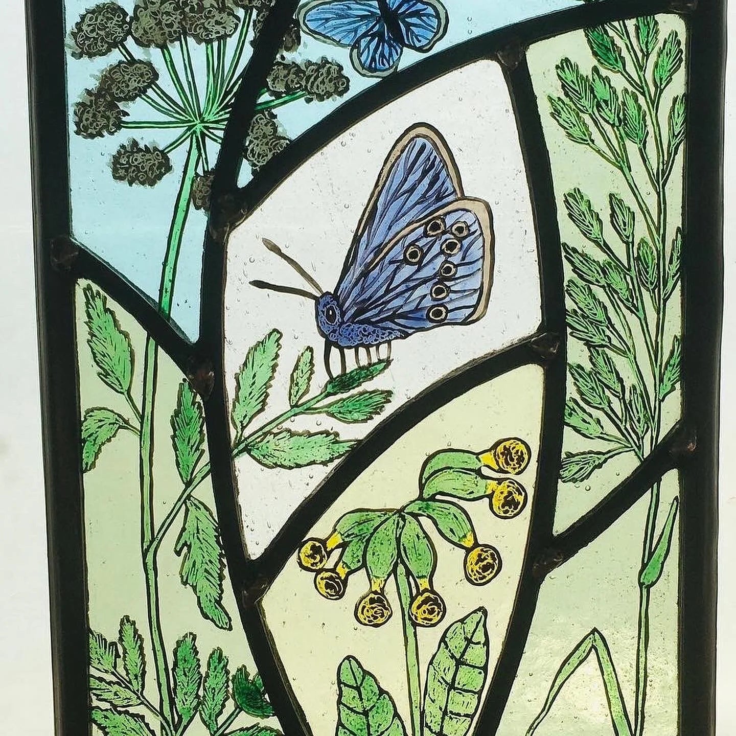 A delicate handcrafted stained-glass panel by Liz Dart, featuring a vivid blue butterfly resting among cow parsley. Each piece is hand-painted using traditional tracing paints and enamel details, giving every panel its own subtle variations in colour and wild grass motifs.